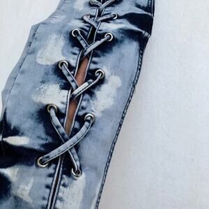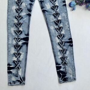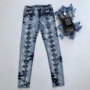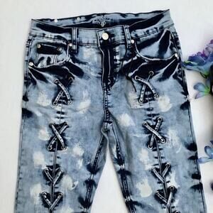 NWOT. Medium Wash Skinny Jeans for Juniors/Women 7/8. Zipper and button for closure, 5 pockets design, has loops, criss cross straps front, back pockets has adjustable straps on top of embroidered brand logo background, distressing front pockets and leg openings. Please note, there are no internal material/care tag. Pictures are part of description.