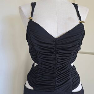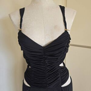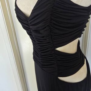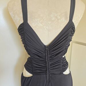 Baby Phat Vintage Black Knit( poly/spandex) Cutout Gown with 1" Straps, V neck and back, back zip, Ruched midriff with side cutouts.
