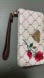 This Baby Phat wallet showcases a sophisticated quilted design in white, accented with vibrant red floral patterns. The elegant zip-around style is complemented by a gold emblem, making it a chic accessory for any occasion.