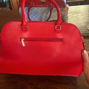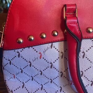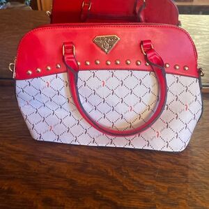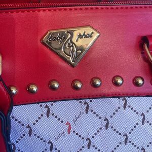 Excellent used condition Baby Phat handbag , cream, brown, red with gold accents, a little wear on the bottom in the back see photo #977