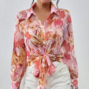 Baby Pink Boho Women's Floral Lantern Long Sleeve Shirt