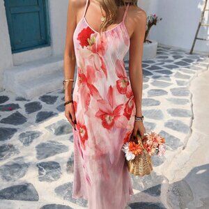 Baby Pink Boho Women's Romantic Floral Print Dress With Pleated Texture