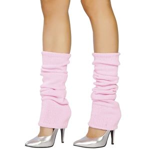 Knit leg warmers. Pair. While lying flat, they measure about 20" long and 4-1/2" across at the widest point. The end is tapered to 3" across at the narrowest point. Great for Halloween costumes! New in package. Genuine Roma product. Baby Pink. 95% Acrylic/5% Spandex.