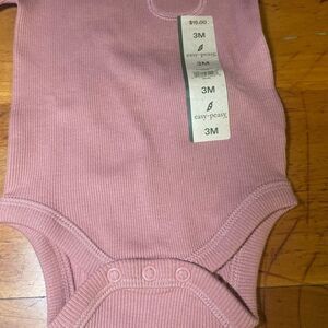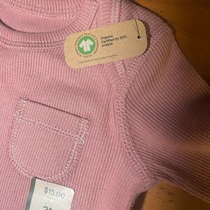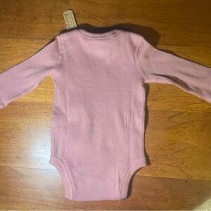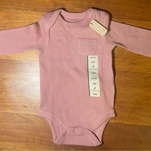 This is a long-sleeve baby onesie in a dusty pink color. It features a small pocket detail on the chest and is designed for infants, specifically size 3 months (3M), as indicated by the tag. The fabric appears to be ribbed for added texture, and it includes snap closures at the bottom for easy diaper changes. The tag suggests the retail price is $15.