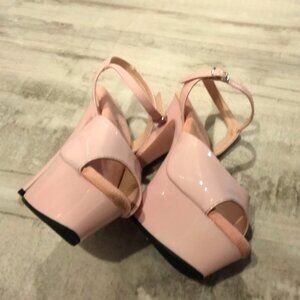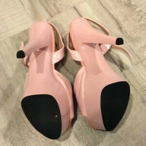 Baby Pink Adore 709 Platform Stiletto Heels in Size 9. These are an ankle strap sandal with a 7-inch stiletto heel and a 2 3/4-inch platform. Some mild scuffs or discoloration from pole dancing. There is a bit of damage to the back of the left shoe's ankle strap, but it still holds securely.