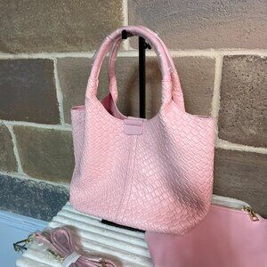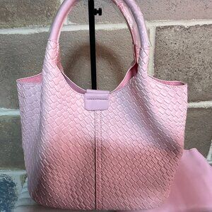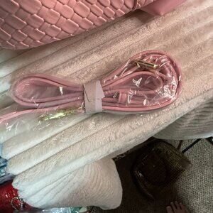 Cute vegan leather satchel has embossed exterior and comes with a pouch and a long strap. Smaller bag, it measures 9.5" x 7" x 5.5" and will hold whatever you need to take with you. Unbranded but a very cute bag.
