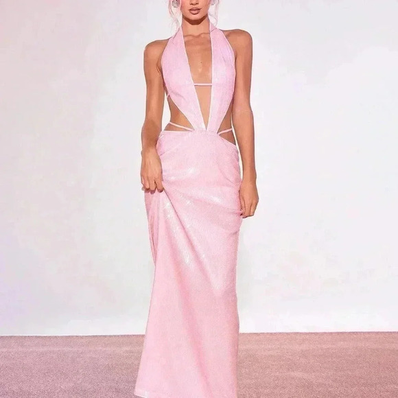 Baby Pink Sexy Women's Sequin Cut Out Front Maxi Dress