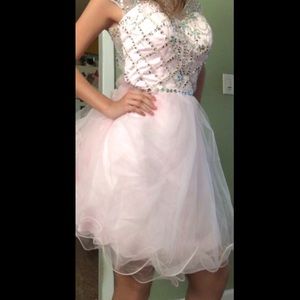 Hi guys, my friend asked me to come to her prom but now she can't go and it's her prom not mine, so I'm selling the dress I bought! it was originally $460, it's never been worn and in perfect condition, but I'm selling it for only $150! It IS short it's just hung up in the picture so it is hanging low down, but it's a little over above knee length! let me know if you have any questions 💜 I can give measurements if needed, perfect for a junior prom!