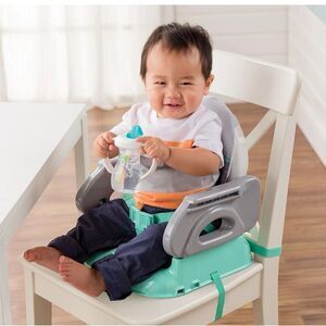 Equipped with a 3-point restraint system to securely fasten your baby, along with chair straps to attach the booster seat safely to any chair.