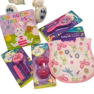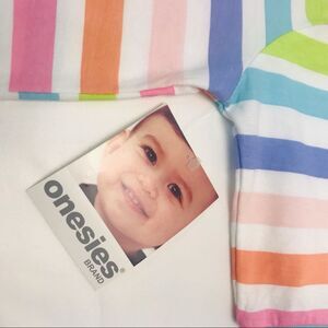 Lightweight Rainbow onesie sleeper with zipper and snap closure. Everything new and included in, binkies, hairbrush & comb, book and bunny. Pink & blue colors included. Perfect for any baby gift basket!