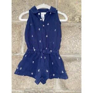 Classic Ralph Lauren baby jumper in size 6 months. Navy blue with an allover anchor print. Good used condition — well cared for and still has plenty of life left.