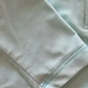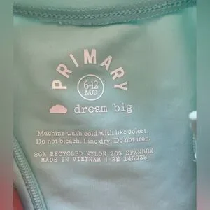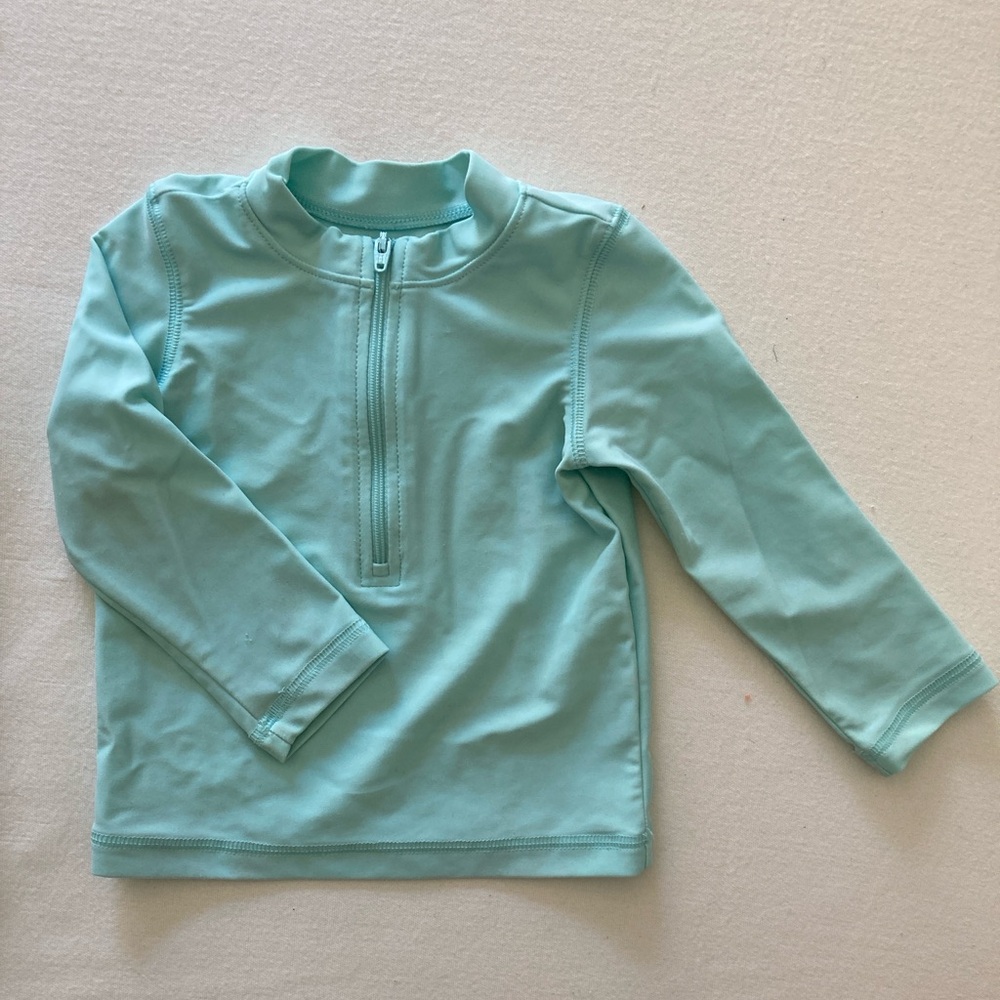 Baby Rash Guard by Primary in mist (light blue) size 6-12 months with small stain and tear shown in photos.