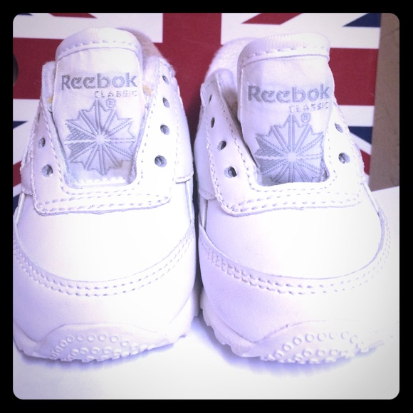 Solid white Baby Reeboks! Used! Don't have the shoe strings in, took them out to clean them.