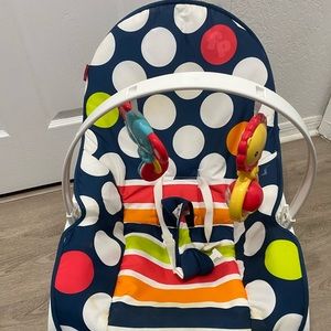 Cute little polkadot rocking chair with safety straps and toys for entertainment.