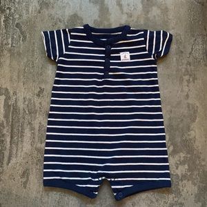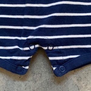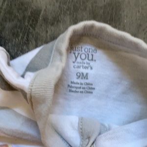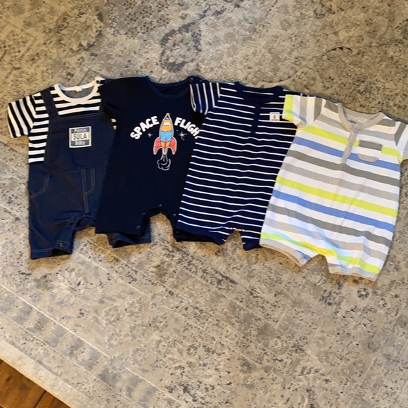 Four baby boy rompers. The two on the right are Carter’s size 9m and the two rompers on the left are PatPat marked with size 73 - these two match up almost exactly with these two 9m rompers but might be a tad larger like for 9-12m. Used but in excellent condition.