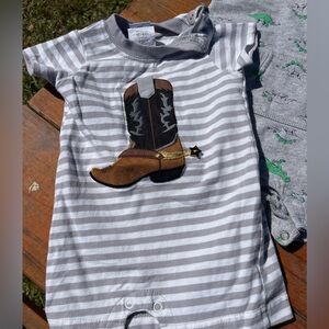 Baby rompers. Set of 3 pieces. 1 is Wally & Willie and 2 are Carter’s brand. Dinosaur romper has spike detail on the hood. On the striped Wally & Willie romper the boot is in suede material with the star sewn on. Smoke free home.