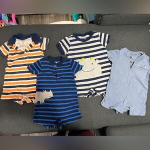 Set of striped baby rompers in blue, orange, and gray. Features cute animal prints.