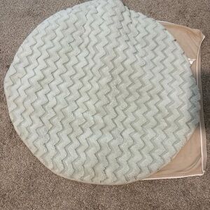 Round rug with a chevron pattern. Features a light green color.