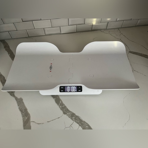 Sleek white digital baby scale with a modern design. Easy-to-read display. $60 retail.