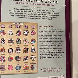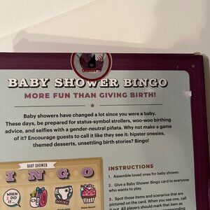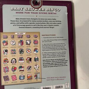 The game includes 12 reusable to play at baby showers. It can be played with 2 to 12 players and includes 12 reusable cards. Each card displays the asme 25 items in different spots. Only 1 player per game will get 5 in a row to win. The cards have bend-back squares. Brand Knock Knock.