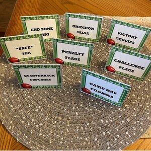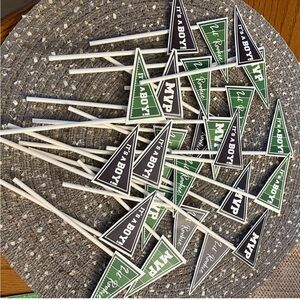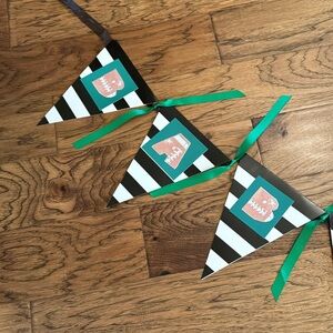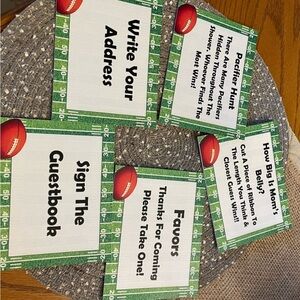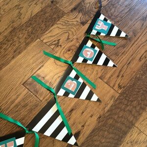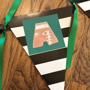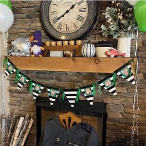 Handmade Baby Boy Banner in green, black and white, used in Football Themed Shower. Letters are football shaped. All pictured Football Shower decorations also included!