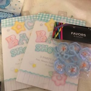 Everything you need for a baby shower. Over $100 worth for $30. Includes: Balloons, party favors, 2 game books, streamers, placards, plastic diaper pins, candles, confetti and more