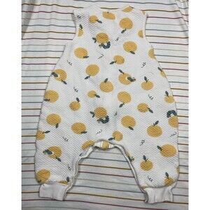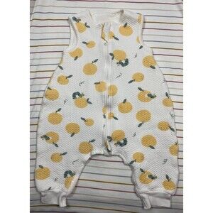 Adorable Duomicaomiao sleeveless baby sleep sack featuring a cheerful orange fruit and caterpillar print. This cozy wearable blanket is designed with legs for easy mobility while keeping your little one snug and warm. Made with a soft quilted cotton shell and lining, plus a lightweight polyester filling for added warmth. Front zipper & snap closure for quick diaper changes and comfortable bedtime routines.