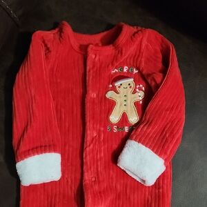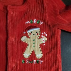 Adorable red velour footed sleeper with embroidered gingerbread design and "Merry & Sweet" text. Features cozy fold-over cuffs and snap closure for easy changes.