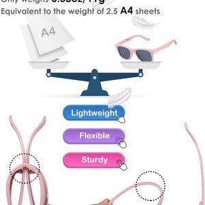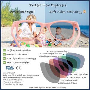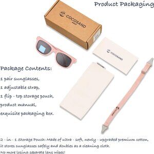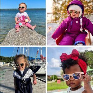 Features: Made from soft, lightweight thermoplastic elastomer that’s comfy and gentle on baby's skin. The polarized lenses block UVA, UVB, and blue rays for HD, glare-free vision—great for protecting little eyes during outdoor fun. Includes an adjustable, removable moisture-wicking strap that grows with your baby. Comes with a stylish pouch, cleaning cloth, and everything you need for easy, safe wear.