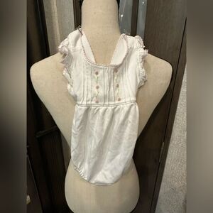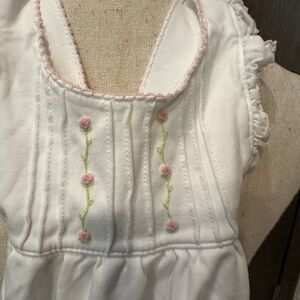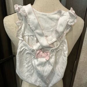 Adorable white baby bib with ruffled edges and pink accents. Perfect for adding a touch of charm to any outfit.