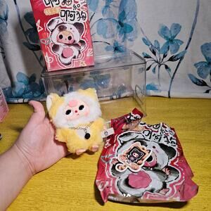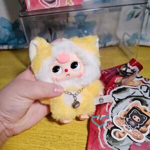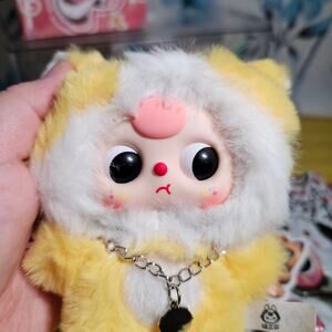 Baby Three Cat & Dog OPENED Blind Box Plush Pendant Blind Box Plush Pendant Yellow White Cat 360 Boba Eyes Pink Hair Pouting Mouth.