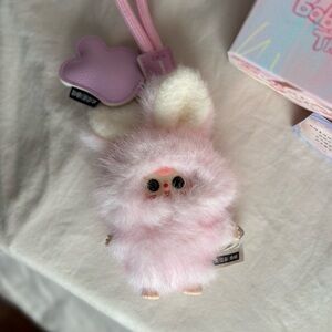 This cutie has the adorable boba eyes, the adorable tongue out mouth, tiny whimsical face tattoos and the sweet pink hair that pairs perfectly with the pink fur. Love the little white ears. The pink purple letter R and pink strap match perfectly with everything. This one is super fluffy!