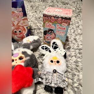 Adorable plush toys in green, gray, and white.