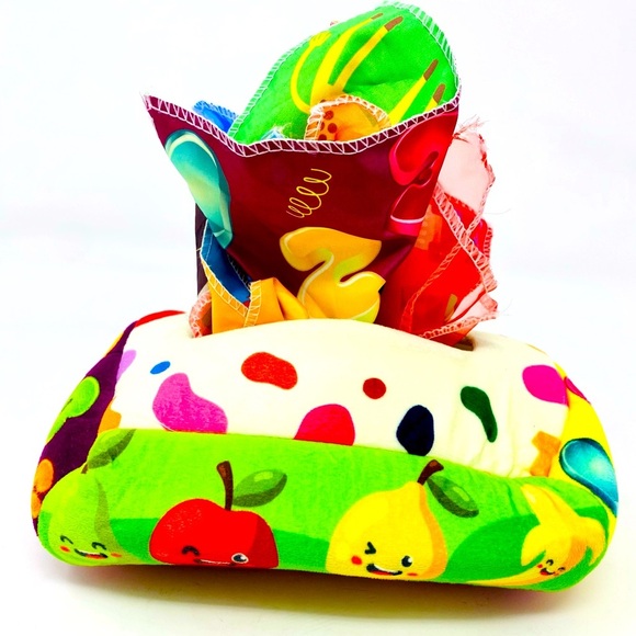 Vibrant baby toy with fruit patterns. Features bright colors and playful designs.
