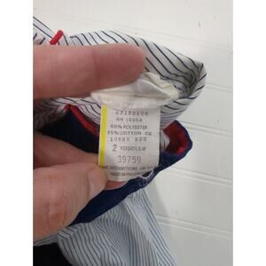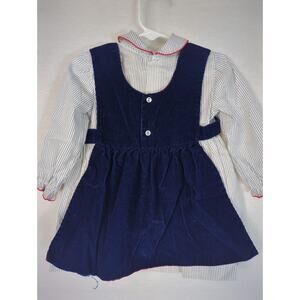 Vintage Baby Togs 2 Piece set. Blue corduroy Pinafore with tulip, windmill scene, button sides and back. Stripped dress with Peter pan collar, red accents on collar and cuffs. Dress has some stains that have not been treated as seen in pictures, elastic in one wrist cuff is no longer stretchy. Size 2T