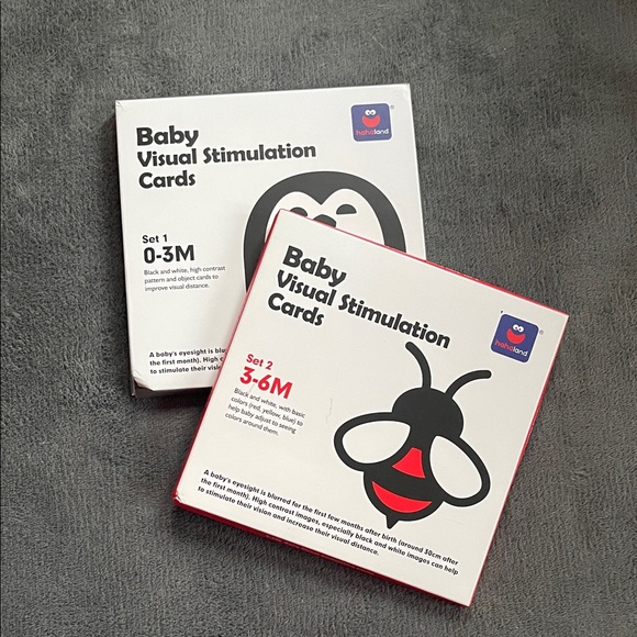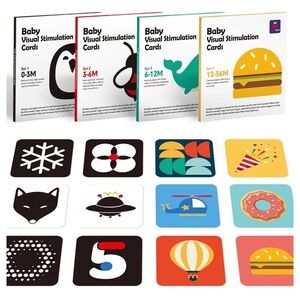 Set of baby visual stimulation cards. Includes sets for 0-3M and 3-6M. Features black, white, and red designs.