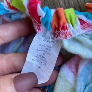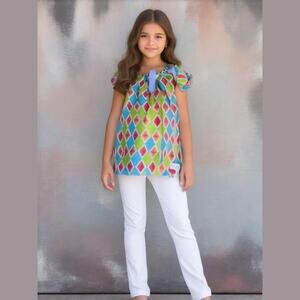 Baby and Me Girls Top Size 7 8 Puff Sleeves Diamond Print Fleur De Lis Blouse