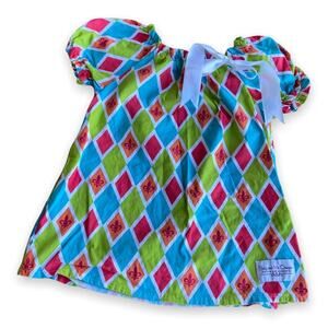 Diamond print pattern in white, kind of an off-red and off-orange, turquoise and lime-ish green.