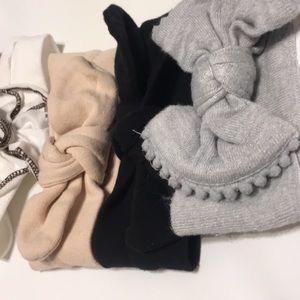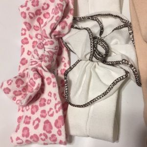 5 baby bows all in excellent condition. These will fit infant and up. The grey one is the smallest and the white flower one is the largest/stretchiest. Pink leopard, grey, black, beige also included. The beige and black are knot bow headbands.
