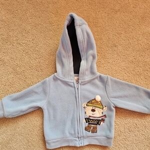 baby boy 0-3 month set from Babies R Us. come with pants and zip-up hoodie. dark blue stitching noted under hood as seen in picture.