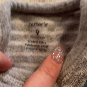 Bundle includes blue and white striped Carter’s size 9 months long sleeve onesie a gray and white footed onesie longsleeve with a monster on the seat and on the chest that’s blue white and orange size 9 months carters blue white striped outfit long sleeve with a small gray dinosaur on the front slight wear but have lots of life left