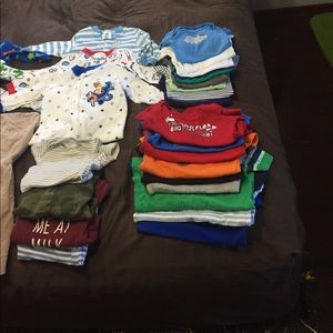 Size 0-3 months. Includes: 18 onesie, 3 long sleeve onesies, 9 pajama onesies, 2 shoes(0-3), 6 pants. 1 jacket.