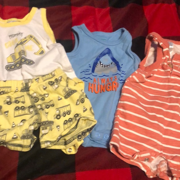 One shark sleeveless onesie, one sleeveless one piece outfit and one summer outfit with shorts and tank onesie with big machinery.