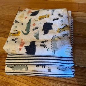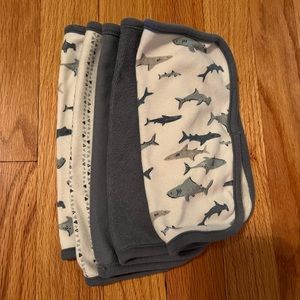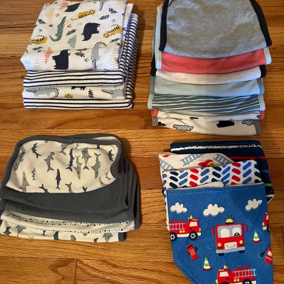 4 Flannel Baby Blanket, 5 baby boy washcloth set, 7 cotton burp cloths, 4 bibs, 3 hats, 9 0-3 socks, 3 gloves