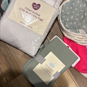 Mesh bumper pads, cart cover, crib mattress pad, crib fitted sheet and 8 bibs. All new or like new condition.