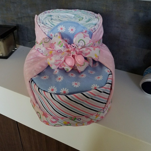 Great for baby showers or a baby gift comes with receiving blankets diapers socks pacifier depending on which diaper cake you buy... receiving blankets very in color