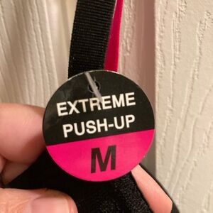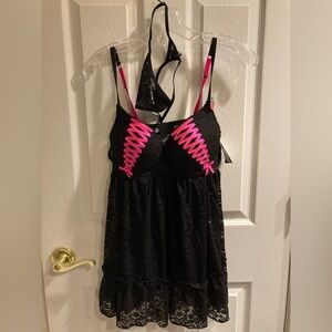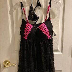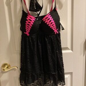 Baby doll lingerie, black lace with thong and pink. Size medium. Push up bra