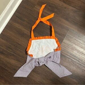 Orange, purple, & white with tie fastening in the back & a bloomer bottom.