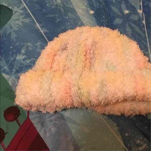 One newborn peach colored crochet hat, two infant-toddler hats, one is plush yarn, in the colors pink, green, blue, yellow and white. The last hat has a peach colored cap with a plush yarn blue, pink, green, yellow and white border. All in new unused condition. Great for a baby shower gift. Bundle and save on shipping