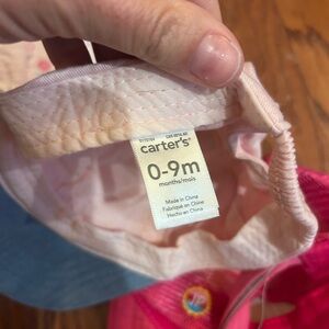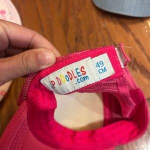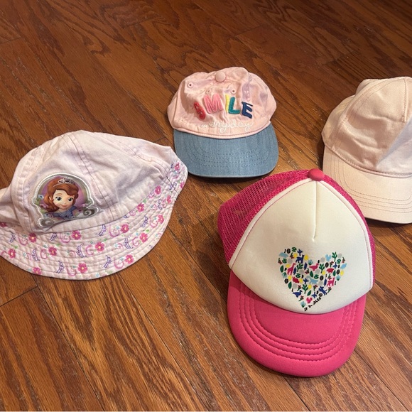 Disney branded girls hat. White front panel with multicolor heart print. Bright pink bill and mesh back. Soft light-pink caps included for mix-and-match wear.